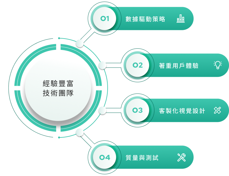 我們的專業團隊結合卓越的設計與最先進的技術累積無數國內外成功案例,更跨足不同產業的需求規劃,為大中小規模企業提供完整需求服務。從企業策劃、設計、開發定 製網站和網路應用。我們提供專業解決方案及有效反饋。 我們通過多項研究和數據驅動策略,確保您的網站創建順暢的數字化旅程,以提高網站質量和性能洞察力,進而提升企業盈收。